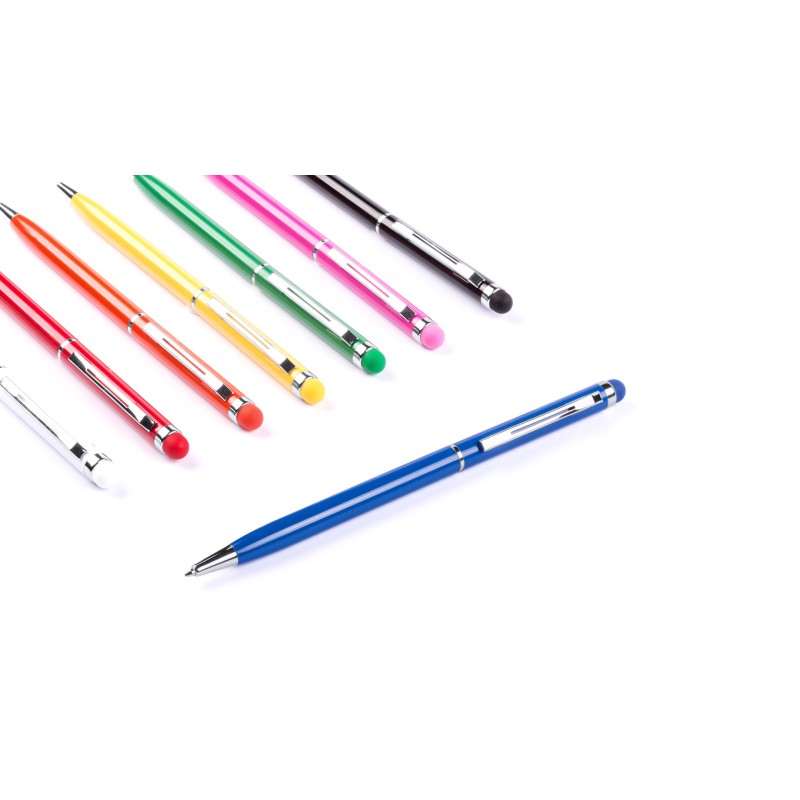 Pointer ball pen with twist mechanism and ultra-fine aluminum body in a smooth metallic finish in varied colors and matching color stylus. Details and rings in silver color. Blue ink.